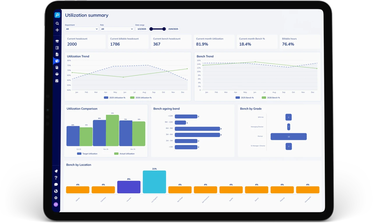 Gain an instant, real-time view of talent deployed across all projects. Access a concise Gantt chart view of who is working on what and for how long. See who is overallocated and who has available bandwidth. Drill down from a global organizational view to specific service lines, departments, or even individuals. This helps prevent employee burnout with balanced workloads and maximizes billable hours by eliminating idle time.